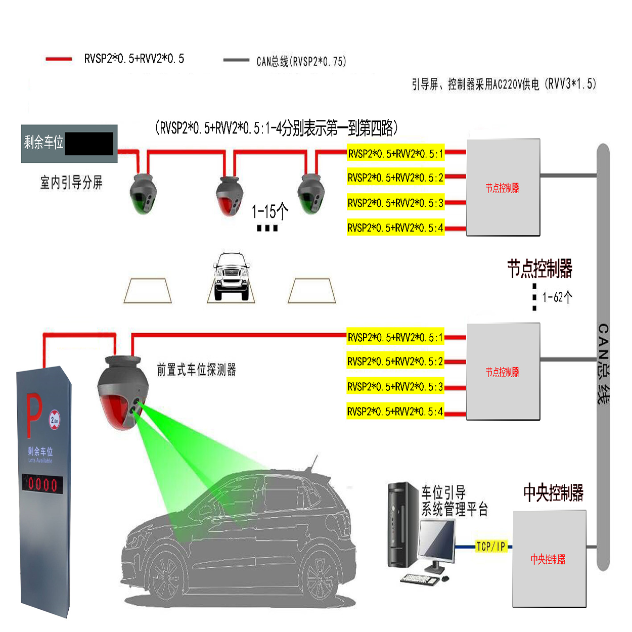 l 整个系统架构采用以太网、CAN-bus、RS485混合组网,与传统采用RS485组网的超声波引导系统相对比,通讯距离远,通讯效率高,高总线利用率,可靠的容错机制,极大的提高系统组网能力,保证数据传输稳定可靠,有效应对超大型停车场车位引导系统的建设及实施;